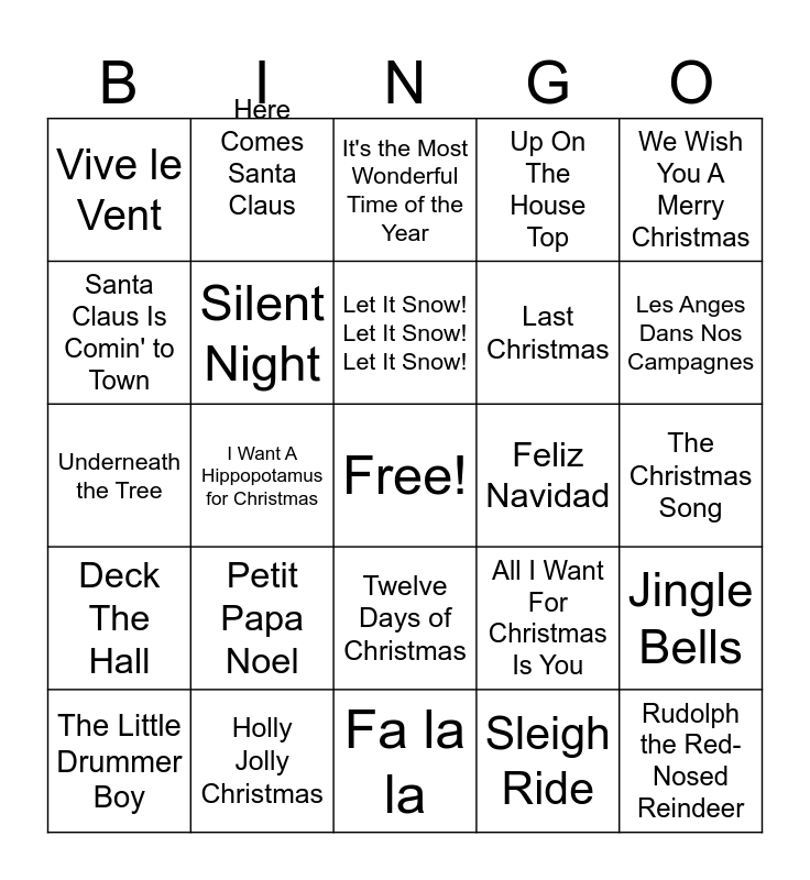 This bingo card has a free space and 39 words: Jingle Bell Rock, O Christmas Tree, Silver Bells, Silent Night, The Little Drummer Boy, Twelve Days of Christmas, Let It Snow! Let It Snow! Let It Snow!, Must Be Santa, We Wish You A Merry Christmas, Deck The Hall, I Want A Hippopotamus for Christmas, Up On The House Top, Rudolph the Red-Nosed Reindeer, The Christmas Song, Feliz Navidad, Petit Papa Noel, Mon Beau Sapin, Vive le Vent, Jolly Old Saint Nicholas, All I Want For Christmas Is You, Santa Claus Is Comin' to Town, Fa la la, Last Christmas, Les Anges Dans Nos Campagnes, L'Enfant au Tambour, Au Royaume du Bonhomme Hiver, Happy Xmas (War is Over), Snowman, Where Are You Christmas?, Here Comes Santa Claus, You're A Mean One, Mr. Grinch, Rockin' Around the Christmas Tree, It's the Most Wonderful Time of the Year, Holly Jolly Christmas, Sleigh Ride, It's Beginning to Look a Lot like Christmas, Jingle Bells, Underneath the Tree and Santa Tell Me.