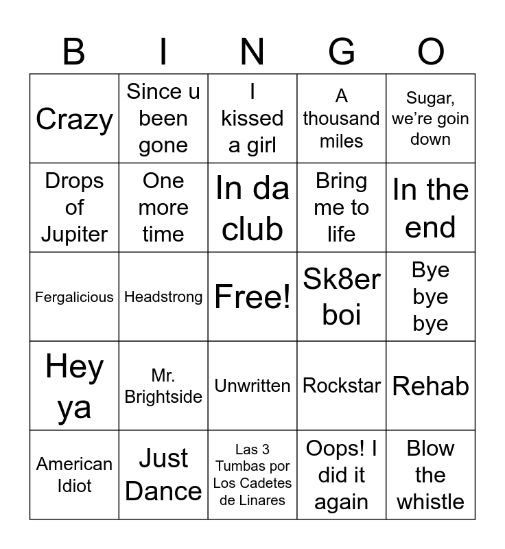 This bingo card has a free space and 24 words: Mr. Brightside, Just Dance, In da club, American Idiot, Sugar, we’re goin down, Crazy, Drops of Jupiter, Since u been gone, Sk8er boi, Unwritten, Bring me to life, Fergalicious, Rockstar, Rehab, One more time, Oops! I did it again, Bye bye bye, I kissed a girl, In the end, Headstrong, Blow the whistle, Hey ya, A thousand miles and Las 3 Tumbas por Los Cadetes de Linares.