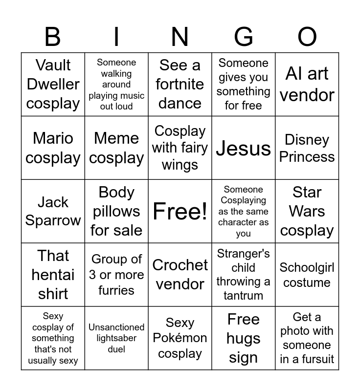 This bingo card has a free space and 39 words: Sailor Moon cosplay, Dragon Ball Z cosplay, Inflatable costume, Meme cosplay, Sexy cosplay of something that's not usually sexy, Crochet vendor, Cosplay with fairy wings, Cosplay with light-up elements, AI art vendor, That hentai shirt, Body pillows for sale, Someone gives you something for free, Get a photo with someone in a fursuit, Star Wars cosplay, Someone Cosplaying as the same character as you, Group of 3 or more furries, Waldo, Vault Dweller cosplay, Someone with a prop as big as they are, Stranger's child throwing a tantrum, Mario cosplay, Sexy Pokémon cosplay, Jesus, Disney Princess, Big group cosplay, Small child in cosplay, Steampunk costume, Mash-up cosplay, Bad Leon Kennedy, Someone walking around playing music out loud, Cute couples cosplay, Man dressed as woman character, See a fortnite dance, Unsanctioned lightsaber duel, Free hugs sign, Very skimpy cosplay, Schoolgirl costume, Jack Sparrow and KPop Demon Hunters cosplay.