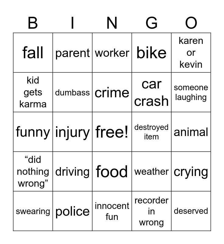 This bingo card has a free space and 24 words: driving, police, crime, swearing, karen or kevin, fall, kid gets karma, parent, destroyed item, food, car crash, funny, weather, crying, dumbass, recorder in wrong, animal, worker, someone laughing, injury, deserved, “did nothing wrong”, bike and innocent fun.