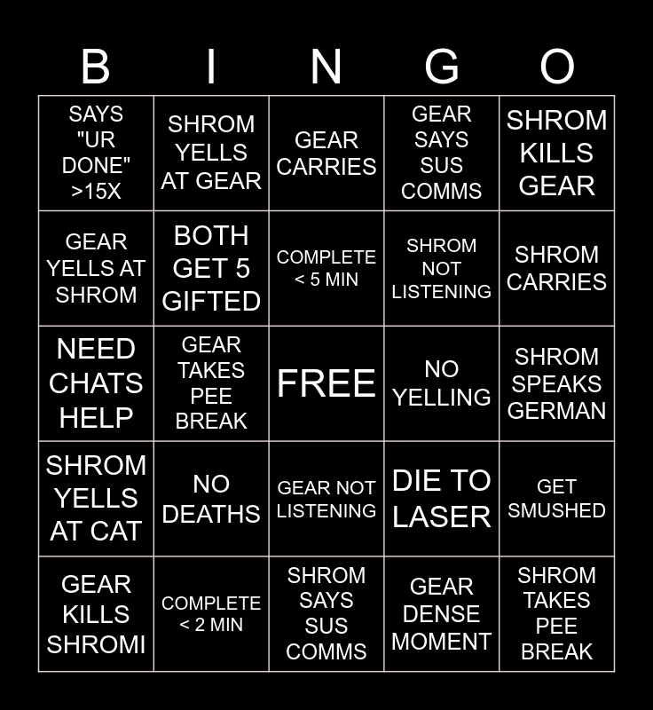 This bingo card has a free space and 24 words: NO DEATHS, COMPLETE < 2 MIN, COMPLETE < 5 MIN, GEAR KILLS SHROMI, SHROM KILLS GEAR, SAYS "UR DONE" >15X, GEAR YELLS AT SHROM, SHROM YELLS AT GEAR, NO YELLING, GEAR NOT LISTENING, SHROM NOT LISTENING, NEED CHATS HELP, DIE TO LASER, GET SMUSHED, BOTH GET 5 GIFTED, GEAR DENSE MOMENT, SHROM SPEAKS GERMAN, GEAR CARRIES, SHROM CARRIES, GEAR TAKES PEE BREAK, SHROM TAKES PEE BREAK, SHROM YELLS AT CAT, GEAR SAYS SUS COMMS and SHROM SAYS SUS COMMS.