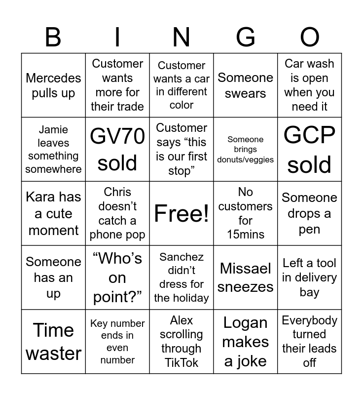 This bingo card has a free space and 27 words: Missael sneezes, Tyson sells a car, Someone brings donuts/veggies, Alex scrolling through TikTok, Jamie leaves something somewhere, Customer wants a car in different color, Customer wants more for their trade, Someone has an up, No customers for 15mins, Left a tool in delivery bay, Kara has a cute moment, Someone swears, Time waster, Key number ends in even number, GCP sold, Coup sold, GV70 sold, Customer says “this is our first stop”, “Who’s on point?”, Mercedes pulls up, Someone drops a pen, Logan makes a joke, Chris doesn’t catch a phone pop, Everybody turned their leads off, Sanchez didn’t dress for the holiday, Car wash is open when you need it and Someone matches outfits.