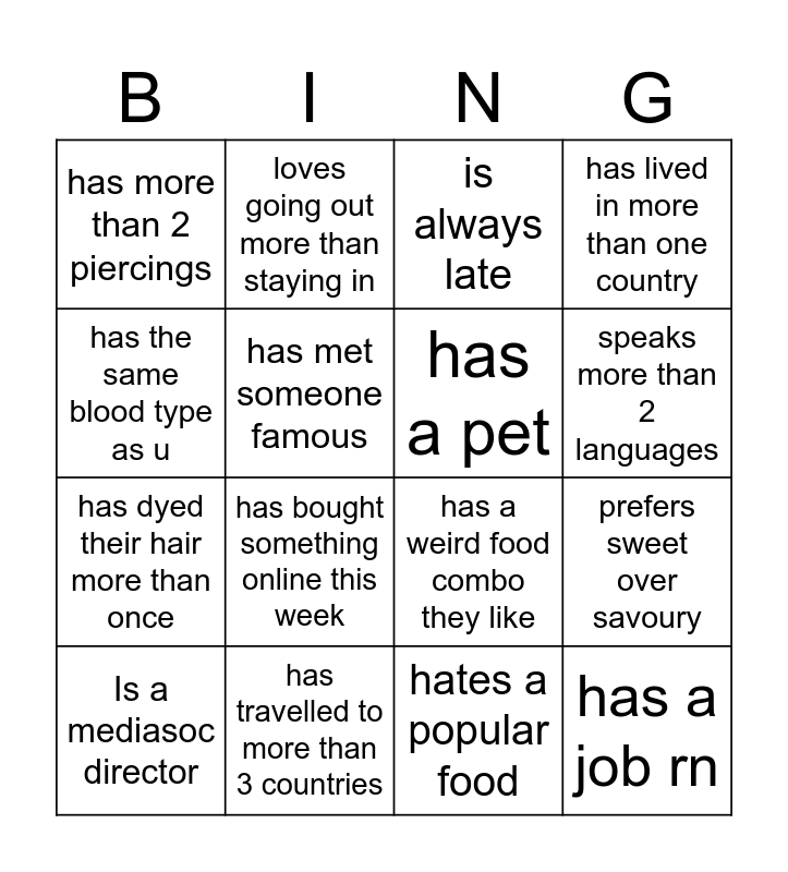 This bingo card has 16 words: has travelled to more than 3 countries, prefers sweet over savoury, is always late, has more than 2 piercings, has dyed their hair more than once, loves going out more than staying in, has a weird food combo they like, hates a popular food, has the same blood type as u, has met someone famous, Is a mediasoc director, has lived in more than one country, has bought something online this week, speaks more than 2 languages, has a pet and has a job rn.