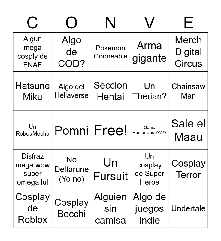 This bingo card has a free space and 24 words: No Deltarune (Yo no), Cosplay Bocchi, Seccion Hentai, Cosplay de Roblox, Merch Digital Circus, Algun mega cosply de FNAF, Hatsune Miku, Algo de COD?, Sonic Humanizado????, Un Fursuit, Un Therian?, Un Robot/Mecha, Un cosplay de Super Heroe, Cosplay Terror, Algo del Hellaverse, Algo de juegos Indie, Sale el Maau, Pokemon Gooneable, Chainsaw Man, Pomni, Undertale, Disfraz mega wow super omega lul, Arma gigante and Alguien sin camisa.