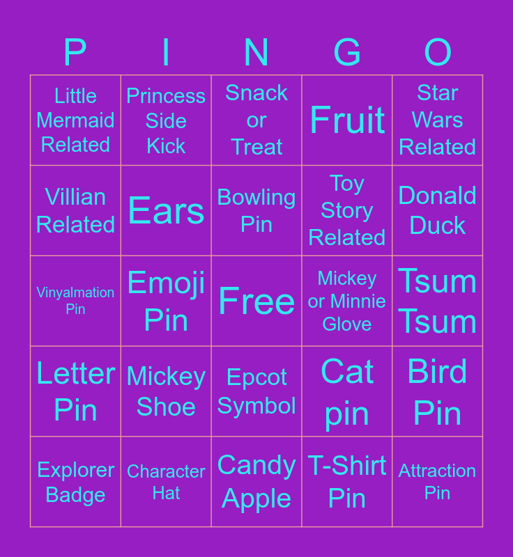 This bingo card has a free space and 24 words: Mickey Shoe, Character Hat, Bowling Pin, Explorer Badge, Star Wars Related, Little Mermaid Related, Villian Related, Princess Side Kick, Mickey or Minnie Glove, Epcot Symbol, Toy Story Related, Vinyalmation Pin, Cat pin, Bird Pin, Ears, T-Shirt Pin, Tsum Tsum, Snack or Treat, Donald Duck, Emoji Pin, Attraction Pin, Letter Pin, Fruit and Candy Apple.