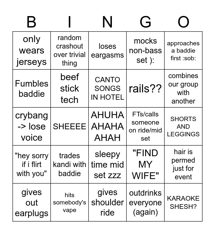 This bingo card has a free space and 24 words: trades kandi with baddie, hits somebody's vape, CANTO SONGS IN HOTEL, gives out earplugs, approaches a baddie first :sob:, only wears jerseys, Fumbles baddie, random crashout over trivial thing, FTs/calls someone on ride/mid set, sleepy time mid set zzz, rails??, crybang -> lose voice, "FIND MY WIFE", hair is permed just for event, beef stick tech, outdrinks everyone (again), SHORTS AND LEGGINGS, loses eargasms, combines our group with another, SHEEEE, KARAOKE SHESH?, "hey sorry if i flirt with you", mocks non-bass set ): and gives shoulder ride.