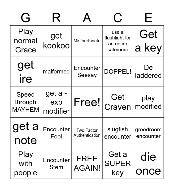 This bingo card has a free space and 24 words: Encounter Fool, Encounter Stem, Encounter Seesay, Play with people, Get a key, Play normal Grace, get ire, get kookoo, Get Craven, Two Factor Authentication, DOPPEL!, Speed through MAYHEM, slugfish encounter, greedroom encounter, malformed, Get a SUPER key, play modified, Misfourtunate, De laddered, get a -exp modifier, die once, get a note, use a flashlight for an entire saferoom and FREE AGAIN!.