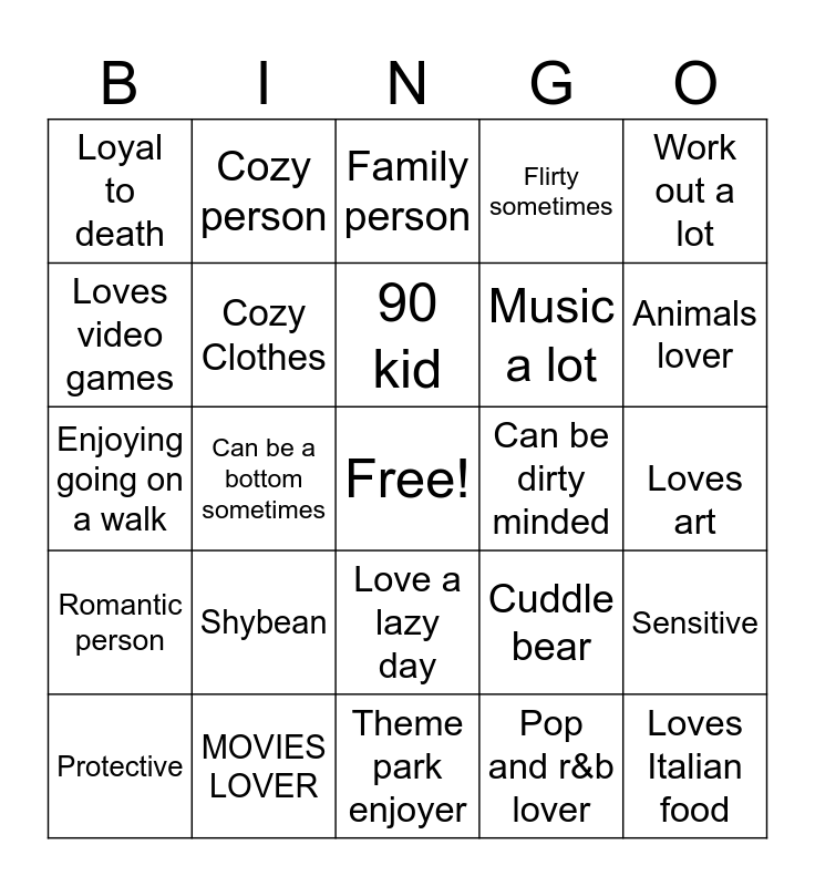 This bingo card has a free space and 24 words: Shybean, MOVIES LOVER, 90 kid, Protective, Work out a lot, Loyal to death, Loves video games, Cozy person, Can be dirty minded, Love a lazy day, Music a lot, Enjoying going on a walk, Cuddle bear, Sensitive, Cozy Clothes, Pop and r&b lover, Loves art, Family person, Animals lover, Can be a bottom sometimes, Loves Italian food, Romantic person, Flirty sometimes and Theme park enjoyer.