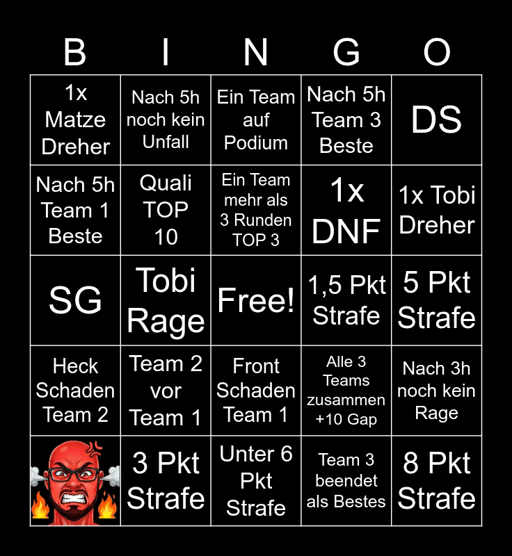 This bingo card has 1 images, a free space and 28 words: Matze Rage, Tobi Rage, 1x DICO Dreher, 1x Matze Dreher, Ein Team auf Podium, Quali TOP 10, Team 2 vor Team 1, 1,5 Pkt Strafe, 3 Pkt Strafe, 5 Pkt Strafe, 8 Pkt Strafe, Unter 6 Pkt Strafe, Team 3 beendet als Bestes, 1x Tobi Dreher, Heck Schaden Team 1, Front Schaden Team 1, Heck Schaden Team 2, DS, SG, Alle 3 Teams zusammen +10 Gap, Hypecar Aufreger, 1x DNF, Nach 5h Team 1 Beste, Nach 5h Team 3 Beste, Nach 5h noch kein Unfall, Nach 3h noch kein Rage, Ein Team mehr als 3 Runden TOP 3 and Alle Teams beenden TOP 10.