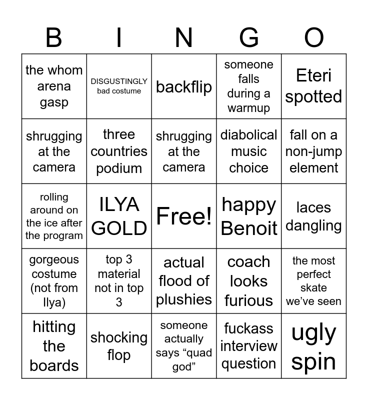 This bingo card has a free space and 24 words: hitting the boards, top 3 material not in top 3, shrugging at the camera, fuckass interview question, Eteri spotted, the whom arena gasp, DISGUSTINGLY bad costume, backflip, happy Benoit, laces dangling, rolling around on the ice after the program, three countries podium, coach looks furious, the most perfect skate we’ve seen, shrugging at the camera, shocking flop, someone actually says “quad god”, someone falls during a warmup, fall on a non-jump element, gorgeous costume (not from Ilya), ILYA GOLD, actual flood of plushies, diabolical music choice and ugly spin.