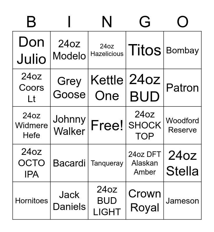 This bingo card has a free space and 27 words: 24oz DFT Alaskan Amber, 24oz BLACK RAVEN, 24oz BUD, 24oz BUD LIGHT, 24oz Coors Lt, 24oz Hazelicious, 24oz Modelo, 24oz OCTO IPA, 24oz SHOCK TOP, 24oz Stella, 24oz Widmere Hefe, Titos, Hornitoes, Jack Daniels, Patron, Pendleton, Grey Goose, Kettle One, Bacardi, Don Julio, Woodford Reserve, Crown Royal, Johnny Walker, Jameson, Tanqueray, Bombay and Captian Morgan's.