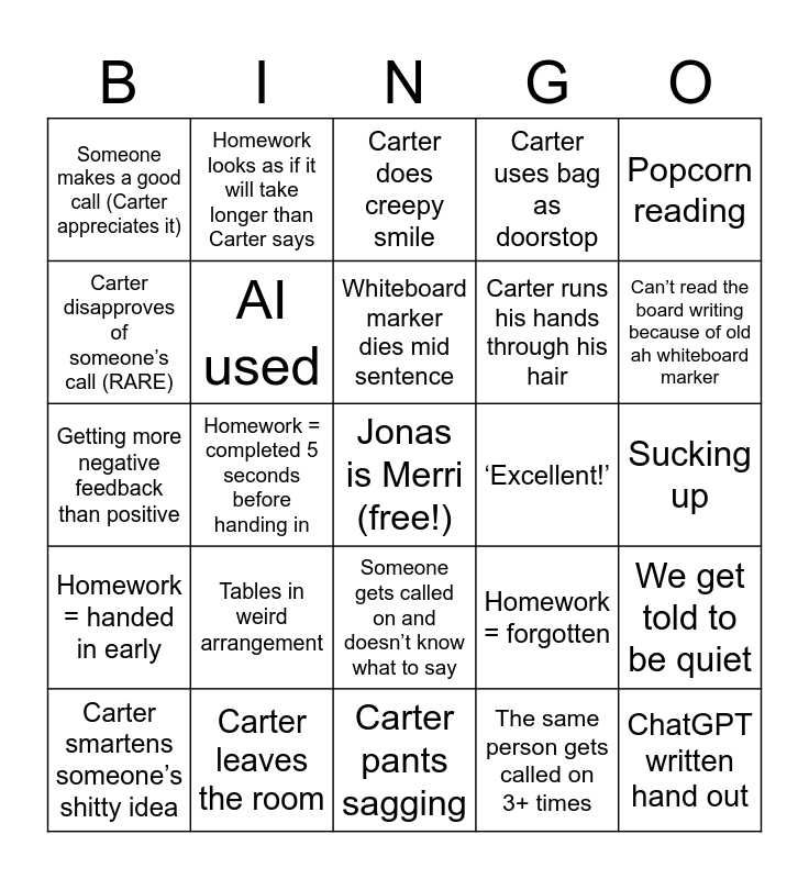 This bingo card has a free space and 24 words: Tables in weird arrangement, Carter leaves the room, Whiteboard marker dies mid sentence, Carter smartens someone’s shitty idea, Popcorn reading, Someone makes a good call (Carter appreciates it), Carter disapproves of someone’s call (RARE), Homework looks as if it will take longer than Carter says, ‘Excellent!’, Someone gets called on and doesn’t know what to say, Carter runs his hands through his hair, Getting more negative feedback than positive, Homework = forgotten, We get told to be quiet, AI used, The same person gets called on 3+ times, Sucking up, Carter does creepy smile, Can’t read the board writing because of old ah whiteboard marker, Homework = completed 5 seconds before handing in, ChatGPT written hand out, Homework = handed in early, Carter uses bag as doorstop and Carter pants sagging.