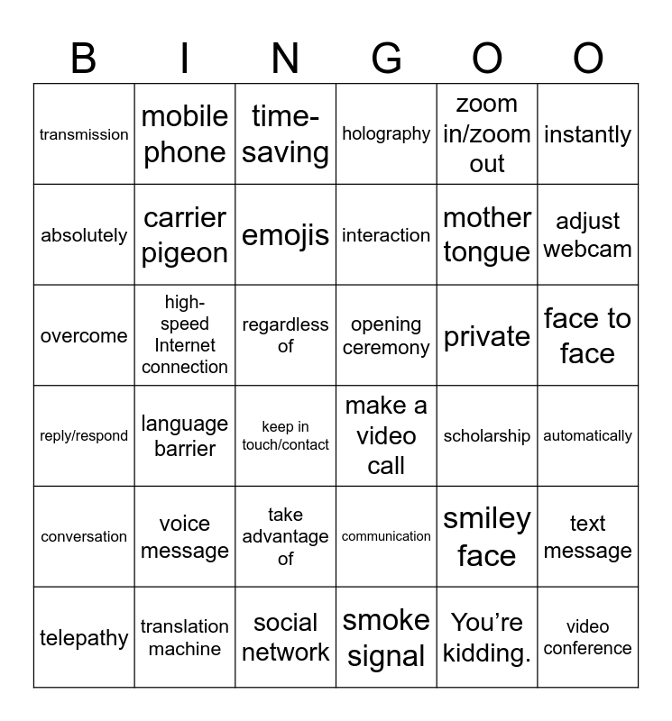 This bingo card has 36 words: communication, take advantage of, smoke signal, absolutely, reply/respond, opening ceremony, carrier pigeon, social network, zoom in/zoom out, smiley face, adjust webcam, holography, text message, high-speed Internet connection, interaction, transmission, conversation, private, overcome, time-saving, regardless of, language barrier, make a video call, keep in touch/contact, scholarship, mobile phone, mother tongue, translation machine, emojis, instantly, video conference, telepathy, automatically, face to face, voice message and You’re kidding..