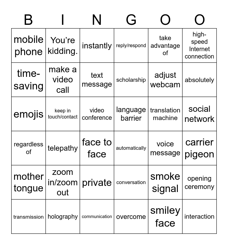 This bingo card has 36 words: conversation, private, overcome, time-saving, regardless of, language barrier, make a video call, communication, take advantage of, smoke signal, absolutely, reply/respond, opening ceremony, keep in touch/contact, scholarship, mobile phone, mother tongue, translation machine, emojis, instantly, video conference, telepathy, automatically, face to face, voice message, You’re kidding., adjust webcam, holography, text message, high-speed Internet connection, interaction, transmission, carrier pigeon, social network, zoom in/zoom out and smiley face.