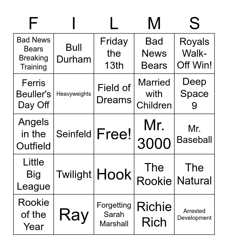 This bingo card has a free space and 67 words: Abbott & Costello, Major League II, The Munsters, The Natural, The Sandlot, 42, Bull Durham, Cheers, Field of Dreams, For Love of the Game, Hook, Moneyball, Mr. Baseball, Royals Walk-Off Win!, The Fan, Ferris Beuller's Day Off, Seinfeld, Bad News Bears Breaking Training, Brewster's Millions, Married with Children, Twilight, Little Big League, Bad News Bears, Richie Rich, The Scout, A League of their Own, Hardball, The Benchwarmers, Deep Space 9, South Park, Arrested Development, Eight Men Out, Futurama, Family Guy, Problem Child, Rookie of the Year, The Naked Gun, The Rookie, Angels in the Outfield, Major League, Summer Catch, Heavyweights, Mr. 3000, The Simpsons, It's Always Sunny in Philadelphia, Extinction, Blazing Saddles, Ray, The Martian Chronicles, Green Lantern, Friday the 13th, Galaxy Quest, Jason Bourne, Whose Line is it Anyway, Chappie, Forgetting Sarah Marshall, Robocop, Suicide Squad, The Shallows, The Time Machine, Taxi Driver, Unhinged, Lawless, The Last Samurai, White House Down, Full Metal Jacket and Mississippi Burning.