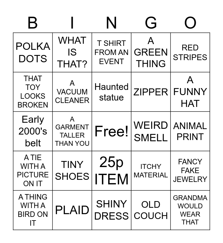 This bingo card has a free space and 24 words: TINY SHOES, PLAID, Haunted statue, A THING WITH A BIRD ON IT, RED STRIPES, POLKA DOTS, THAT TOY LOOKS BROKEN, WHAT IS THAT?, WEIRD SMELL, 25p ITEM, ZIPPER, Early 2000's belt, ITCHY MATERIAL, FANCY FAKE JEWELRY, A VACUUM CLEANER, OLD COUCH, ANIMAL PRINT, T SHIRT FROM AN EVENT, A FUNNY HAT, A GARMENT TALLER THAN YOU, GRANDMA WOULD WEAR THAT, A TIE WITH A PICTURE ON IT, A GREEN THING and SHINY DRESS.