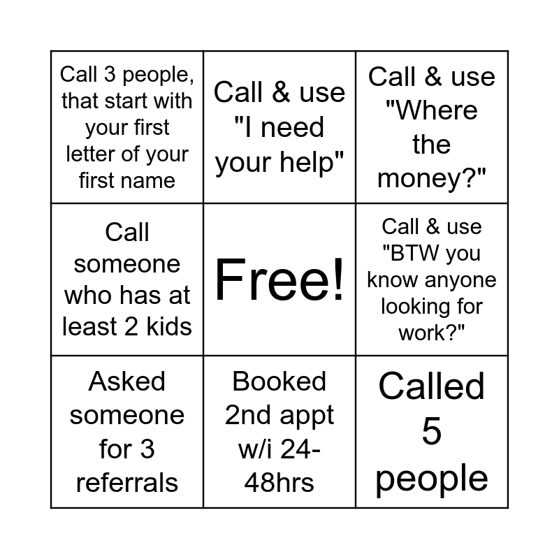 This bingo card has a free space and 11 words: Booked 1st appt w/i 12-24hrs, Booked 2nd appt w/i 24-48hrs, Called 5 people, Asked someone for 3 referrals, Call & use "I need your help", Call & use "Where the money?", Call & use "BTW you know anyone looking for work?", Call someone who on your call history, Call someone who has at least 2 kids, Call 3 people, that start with your first letter of your first name and Call 3 people, that start with your first letter of your last name.