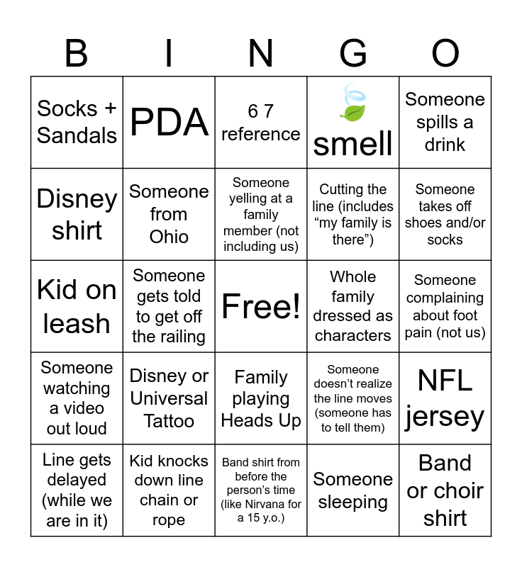This bingo card has a free space and 24 words: Disney or Universal Tattoo, Kid knocks down line chain or rope, Someone yelling at a family member (not including us), Line gets delayed (while we are in it), Someone spills a drink, Socks + Sandals, Disney shirt, PDA, Whole family dressed as characters, Family playing Heads Up, Cutting the line (includes “my family is there”), Kid on leash, Someone doesn’t realize the line moves (someone has to tell them), NFL jersey, Someone from Ohio, Someone sleeping, Someone complaining about foot pain (not us), 6 7 reference, Someone takes off shoes and/or socks, Someone gets told to get off the railing, Band or choir shirt, Someone watching a video out loud, 🍃 smell and Band shirt from before the person’s time (like Nirvana for a 15 y.o.).