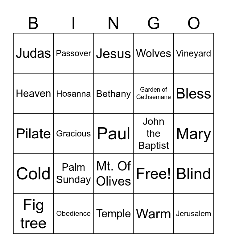 This bingo card has 25 words: Palm Sunday, Temple, Bethany, Fig tree, Vineyard, Judas, Heaven, Passover, John the Baptist, Mt. Of Olives, Garden of Gethsemane, Pilate, Free!, Blind, Hosanna, Jerusalem, Mary, Jesus, Bless, Gracious, Paul, Obedience, Cold, Wolves and Warm.