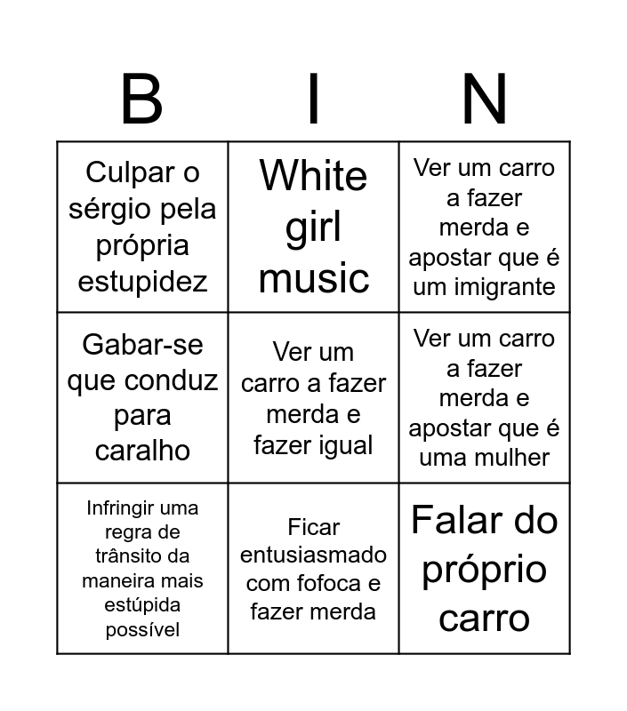 This bingo card has a free space and 8 words: Ver um carro a fazer merda e apostar que é uma mulher, Ver um carro a fazer merda e apostar que é um imigrante, White girl music, Infringir uma regra de trânsito da maneira mais estúpida possível, Culpar o sérgio pela própria estupidez, Falar do próprio carro, Gabar-se que conduz para caralho and Ficar entusiasmado com fofoca e fazer merda.