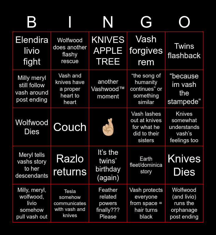 This bingo card has a free space and 24 words: Milly, meryl, wolfwood, livio somehow pull vash out, Razlo returns, another Vashwood™️ moment, Vash protects everyone from space = hair turns black, Twins flashback, Elendira livio fight, Wolfwood does another flashy rescue, KNIVES APPLE TREE, Vash lashes out at knives for what he did to their sisters, Knives somewhat understands vash’s feelings too, Wolfwood Dies, Vash and knives have a proper heart to heart, Earth fleet/dominica story, Knives Dies, Milly meryl still follow vash around post ending, Tesla somehow communicates with vash and knives, Feather related powers finally??? Please, Vash forgives rem, “because im vash the stampede”, Meryl tells vashs story to her descendants, Couch, It’s the twins’ birthday (again), “the song of humanity continues” or something similar and Wolfwood (and livio) runs the orphanage post ending.