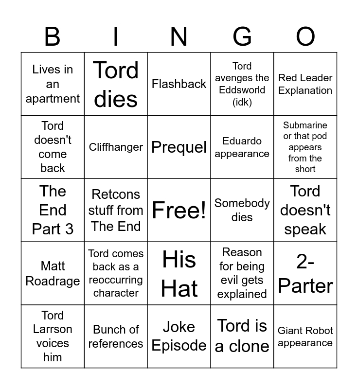 This bingo card has a free space and 24 words: Tord comes back as a reoccurring character, Bunch of references, Prequel, Tord Larrson voices him, Red Leader Explanation, Lives in an apartment, Tord doesn't come back, Tord dies, Somebody dies, His Hat, Eduardo appearance, The End Part 3, Reason for being evil gets explained, 2-Parter, Cliffhanger, Tord is a clone, Tord doesn't speak, Flashback, Submarine or that pod appears from the short, Retcons stuff from The End, Giant Robot appearance, Matt Roadrage, Tord avenges the Eddsworld (idk) and Joke Episode.