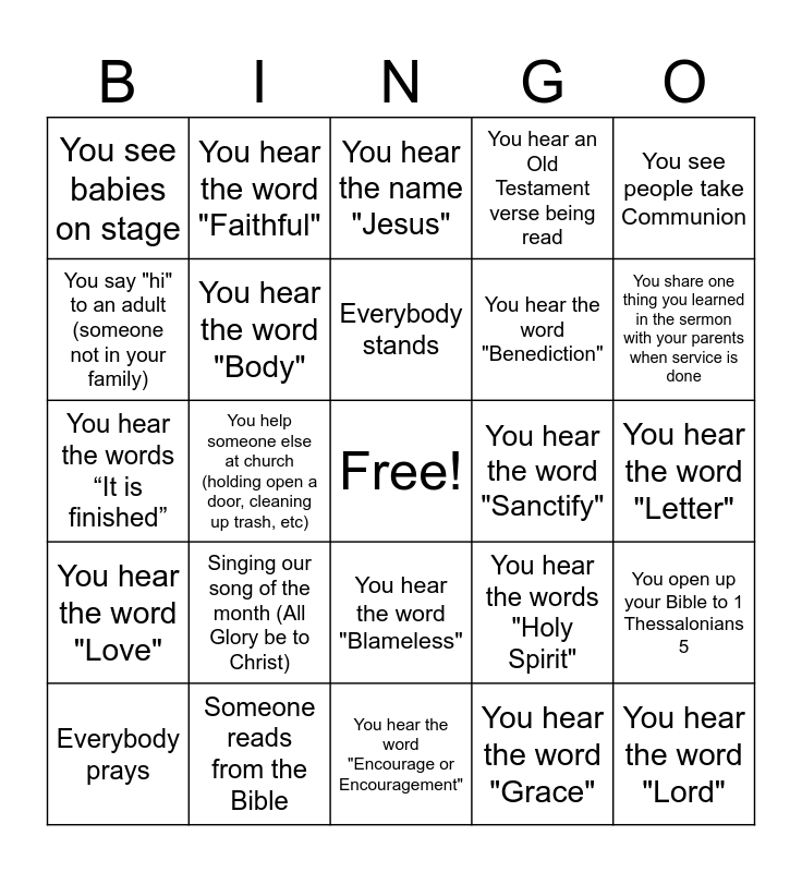 This bingo card has a free space and 24 words: Singing our song of the month (All Glory be to Christ), Someone reads from the Bible, Everybody stands, Everybody prays, You see people take Communion, You see babies on stage, You say "hi" to an adult (someone not in your family), You hear the word "Faithful", You hear the word "Sanctify", You hear the word "Blameless", You hear the word "Benediction", You hear the words “It is finished”, You hear the words "Holy Spirit", You open up your Bible to 1 Thessalonians 5, You hear the word "Body", You hear the word "Grace", You hear the word "Letter", You hear the name "Jesus", You share one thing you learned in the sermon with your parents when service is done, You help someone else at church (holding open a door, cleaning up trash, etc), You hear the word "Lord", You hear the word "Love", You hear an Old Testament verse being read and You hear the word "Encourage or Encouragement".
