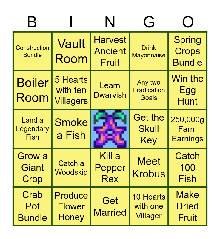 This bingo card has a free space and 24 words: Catch a Woodskip, Produce Flower Honey, Learn Dwarvish, Crab Pot Bundle, Spring Crops Bundle, Construction Bundle, Boiler Room, Vault Room, Get the Skull Key, Kill a Pepper Rex, Any two Eradication Goals, Land a Legendary Fish, Meet Krobus, Catch 100 Fish, 5 Hearts with ten Villagers, 10 Hearts with one Villager, 250,000g Farm Earnings, Harvest Ancient Fruit, Win the Egg Hunt, Smoke a Fish, Make Dried Fruit, Grow a Giant Crop, Drink Mayonnaise and Get Married.