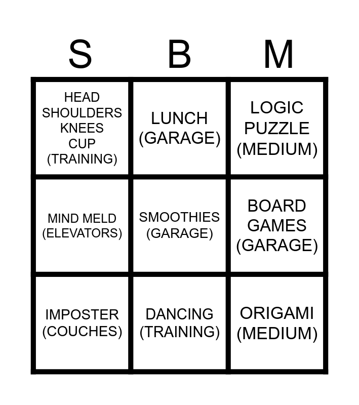 This bingo card has 9 words: IMPOSTER (COUCHES), SMOOTHIES (GARAGE), LOGIC PUZZLE (MEDIUM), HEAD SHOULDERS KNEES CUP (TRAINING), LUNCH (GARAGE), BOARD GAMES (GARAGE), MIND MELD (ELEVATORS), DANCING (TRAINING) and ORIGAMI (MEDIUM).