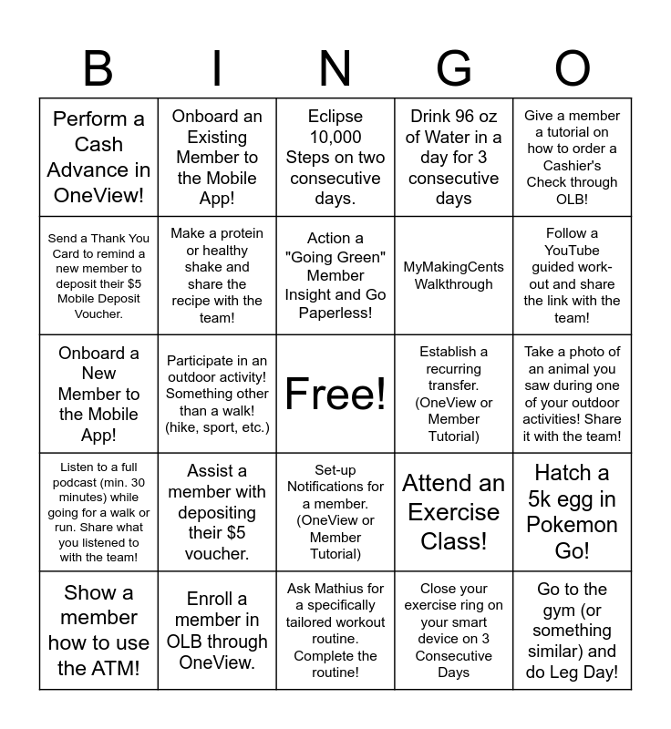 This bingo card has a free space and 24 words: Assist a member with depositing their $5 voucher., Enroll a member in OLB through OneView., Action a "Going Green" Member Insight and Go Paperless!, Show a member how to use the ATM!, Give a member a tutorial on how to order a Cashier's Check through OLB!, Perform a Cash Advance in OneView!, Send a Thank You Card to remind a new member to deposit their $5 Mobile Deposit Voucher., Onboard an Existing Member to the Mobile App!, Establish a recurring transfer. (OneView or Member Tutorial), Set-up Notifications for a member. (OneView or Member Tutorial), MyMakingCents Walkthrough, Onboard a New Member to the Mobile App!, Attend an Exercise Class!, Hatch a 5k egg in Pokemon Go!, Make a protein or healthy shake and share the recipe with the team!, Close your exercise ring on your smart device on 3 Consecutive Days, Take a photo of an animal you saw during one of your outdoor activities! Share it with the team!, Eclipse 10,000 Steps on two consecutive days., Follow a YouTube guided work-out and share the link with the team!, Participate in an outdoor activity! Something other than a walk! (hike, sport, etc.), Go to the gym (or something similar) and do Leg Day!, Listen to a full podcast (min. 30 minutes) while going for a walk or run. Share what you listened to with the team!, Drink 96 oz of Water in a day for 3 consecutive days and Ask Mathius for a specifically tailored workout routine. Complete the routine!.