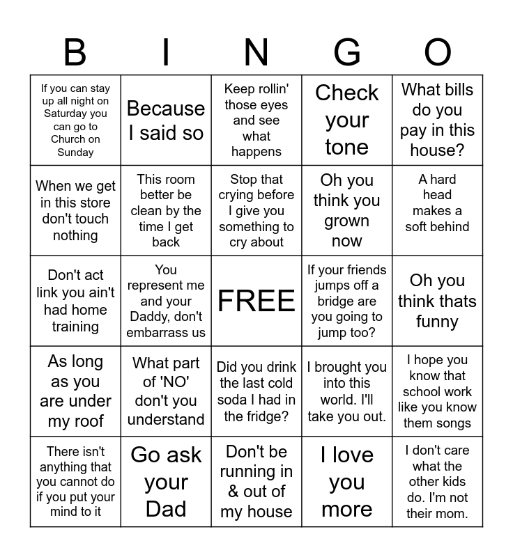 This bingo card has a free space and 24 words: What part of 'NO' don't you understand, Go ask your Dad, Stop that crying before I give you something to cry about, There isn't anything that you cannot do if you put your mind to it, What bills do you pay in this house?, If you can stay up all night on Saturday you can go to Church on Sunday, When we get in this store don't touch nothing, Because I said so, If your friends jumps off a bridge are you going to jump too?, Did you drink the last cold soda I had in the fridge?, Oh you think you grown now, Don't act link you ain't had home training, I brought you into this world. I'll take you out., I hope you know that school work like you know them songs, This room better be clean by the time I get back, I love you more, Oh you think thats funny, Keep rollin' those eyes and see what happens, A hard head makes a soft behind, You represent me and your Daddy, don't embarrass us, I don't care what the other kids do. I'm not their mom., As long as you are under my roof, Check your tone and Don't be running in & out of my house.