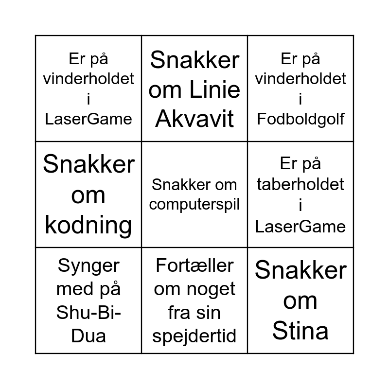 This bingo card has 13 words: Free!, Synger med på en ”Seebach”, Synger med på Shu-Bi-Dua, Snakker om Linie Akvavit, Snakker om kodning, Snakker om computerspil, Snakker om Stina, Færdiggør sin drik, Fortæller om noget fra sin spejdertid, Er på vinderholdet i LaserGame, Er på taberholdet i LaserGame, Er på vinderholdet i Fodboldgolf and Er på taberholdet i Fodboldgolf.