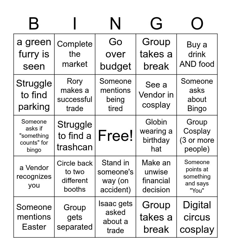 This bingo card has a free space and 24 words: Circle back to two different booths, Group gets separated, Someone mentions being tired, Someone mentions Easter, Buy a drink AND food, a green furry is seen, Struggle to find parking, Complete the market, Globin wearing a birthday hat, Stand in someone's way (on accident), See a Vendor in cosplay, Someone asks if "something counts" for bingo, Make an unwise financial decision, Someone points at something and says "You", Rory makes a successful trade, Group takes a break, Group Cosplay (3 or more people), Go over budget, Someone asks about Bingo, Struggle to find a trashcan, Digital circus cosplay, a Vendor recognizes you, Group takes a break and Isaac gets asked about a trade.