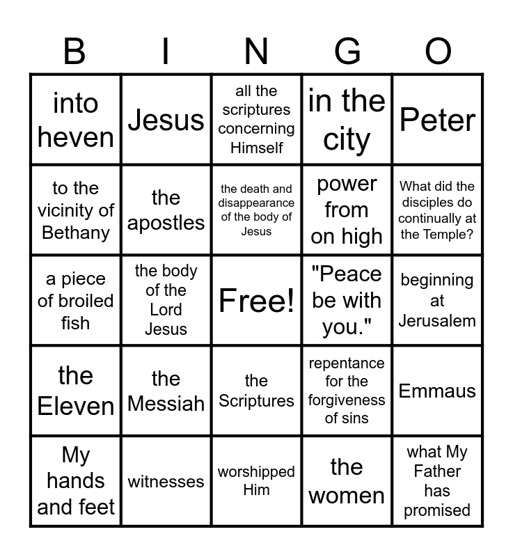 This bingo card has a free space and 32 words: the women, the stone, the body of the Lord Jesus, two men, the Eleven, the apostles, Peter, Emmaus, Jesus, Cleopas, the death and disappearance of the body of Jesus, all the scriptures concerning Himself, while Jesus was at the table with them, Jerusalem and the disciples, "Peace be with you.", a ghost, My hands and feet, a piece of broiled fish, the Scriptures, the Messiah, repentance for the forgiveness of sins, to all nations, beginning at Jerusalem, witnesses, what My Father has promised, in the city, power from on high, to the vicinity of Bethany, into heven, worshipped Him, Jerusalem and the Temple and What did the disciples do continually at the Temple?.