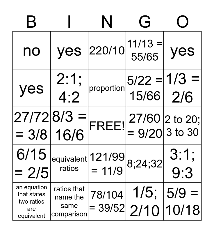 This bingo card has a free space and 24 words: equivalent ratios, ratios that name the same comparison, proportion, an equation that states two ratios are equivalent, yes, no, yes, yes, 27/60 = 9/20, 121/99 = 11/9, 5/22 = 15/66, 27/72 = 3/8, 8;24;32, 3:1; 9:3, 2:1; 4:2, 1/5; 2/10, 2 to 20; 3 to 30, 220/10, 1/3 = 2/6, 8/3 = 16/6, 5/9 = 10/18, 6/15 = 2/5, 11/13 = 55/65 and 78/104 = 39/52.