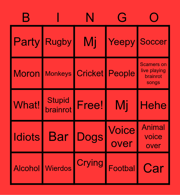 This bingo card has a free space and 24 words: Alcohol, Bar, Cricket, Footbal, Soccer, Party, Rugby, Mj, Mj, Hehe, What!, Monkeys, Voice over, Animal voice over, Moron, Wierdos, Crying, Yeepy, Scamers on live playing brainrot songs, Idiots, Stupid brainrot, Dogs, People and Car.