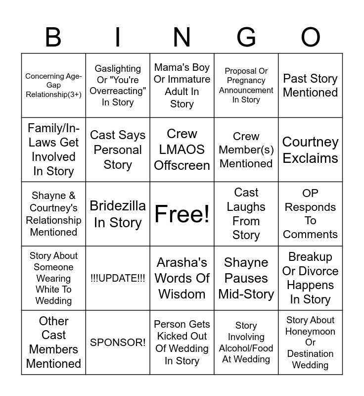 This bingo card has a free space and 24 words: !!!UPDATE!!!, SPONSOR!, Crew LMAOS Offscreen, Other Cast Members Mentioned, Past Story Mentioned, Concerning Age-Gap Relationship(3+), Family/In-Laws Get Involved In Story, Gaslighting Or "You're Overreacting" In Story, Cast Laughs From Story, Arasha's Words Of Wisdom, Crew Member(s) Mentioned, Shayne & Courtney's Relationship Mentioned, Shayne Pauses Mid-Story, Breakup Or Divorce Happens In Story, Cast Says Personal Story, Story Involving Alcohol/Food At Wedding, OP Responds To Comments, Mama's Boy Or Immature Adult In Story, Courtney Exclaims, Bridezilla In Story, Story About Honeymoon Or Destination Wedding, Story About Someone Wearing White To Wedding, Proposal Or Pregnancy Announcement In Story and Person Gets Kicked Out Of Wedding In Story.