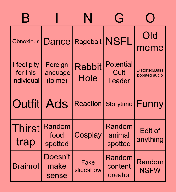 This bingo card has a free space and 29 words: Brainrot, AI Spotted, Ads, Animation/Art, Obnoxious, Ragebait, Foreign language (to me), Random food spotted, Storytime, Doesn't make sense, Funny, Random NSFW, Fake slideshow, Random content creator, Distorted/Bass boosted audio, Gameplay, Cosplay, Thirst trap, Old meme, Outfit, Random animal spotted, Skit, Potential Cult Leader, I feel pity for this individual, NSFL, Dance, Edit of anything, Rabbit Hole and Creepy.