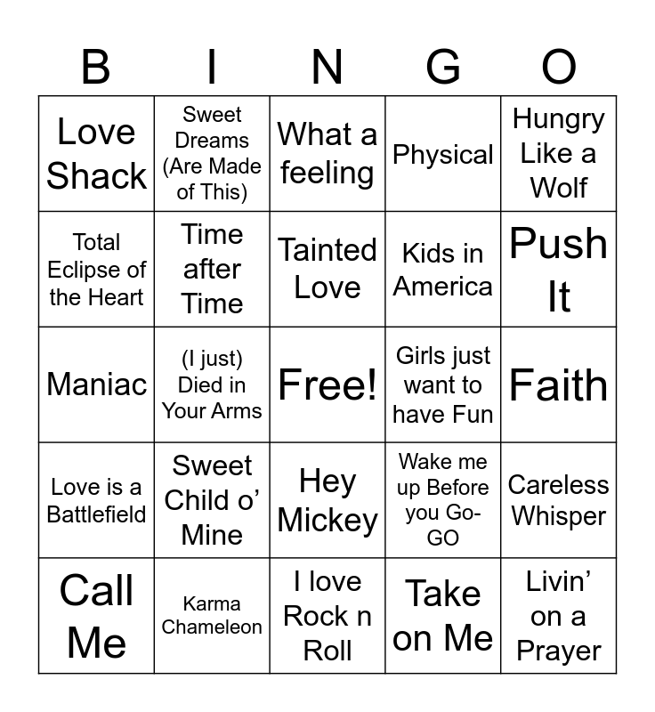 This bingo card has a free space and 53 words: Eye of the Tiger, Livin’ on a Prayer, Every Breath you Take, Take on Me, Sweet Child o’ Mine, Don’t you (Forget about me), Sweet Dreams (Are Made of This), Another One Bite the Dust, Total Eclipse of the Heart, Come on Eileen, Time after Time, I wanna Dance with Somebody, Careless Whisper, Wake me up Before you Go-GO, Don’t you want me, Call Me, Tainted Love, Girls just want to have Fun, Jump, Hungry Like a Wolf, (I just) Died in Your Arms, When a Doves Cry, Kids in America, Love Shack, Jessie’s Girl, Karma Chameleon, You Spin Me Round, Jake and Diane, Pour Some Sugar on Me, Push It, Like a Prayer, Crazy little Thing Called Love, Addicted to Love, Here I go Again, Should I stay or Should I go, In the air tonight, Physical, I love Rock n Roll, What a feeling, Billie Jean, What’s Love Got to Do With it, It’s Still rock and Rock to me, Faith, Straight Up, Every Rose Has its Thorn, Hey Mickey, I want to know what love is, Who can it be now, Maniac, Love is a Battlefield, Under Pressure, 8675309 Jenny and Fight for Your Right.