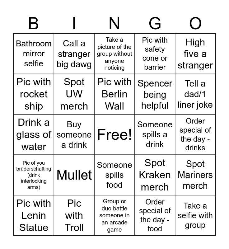 This bingo card has a free space and 24 words: Mullet, Pic with Troll, Pic with Berlin Wall, Pic with Lenin Statue, High five a stranger, Bathroom mirror selfie, Pic with rocket ship, Call a stranger big dawg, Someone spills a drink, Someone spills food, Spencer being helpful, Drink a glass of water, Spot Kraken merch, Spot Mariners merch, Spot UW merch, Order special of the day - food, Order special of the day - drinks, Take a picture of the group without anyone noticing, Tell a dad/1 liner joke, Buy someone a drink, Take a selfie with group, Pic of you brüderschafting (drink interlocking arms), Pic with safety cone or barrier and Group or duo battle someone in an arcade game.