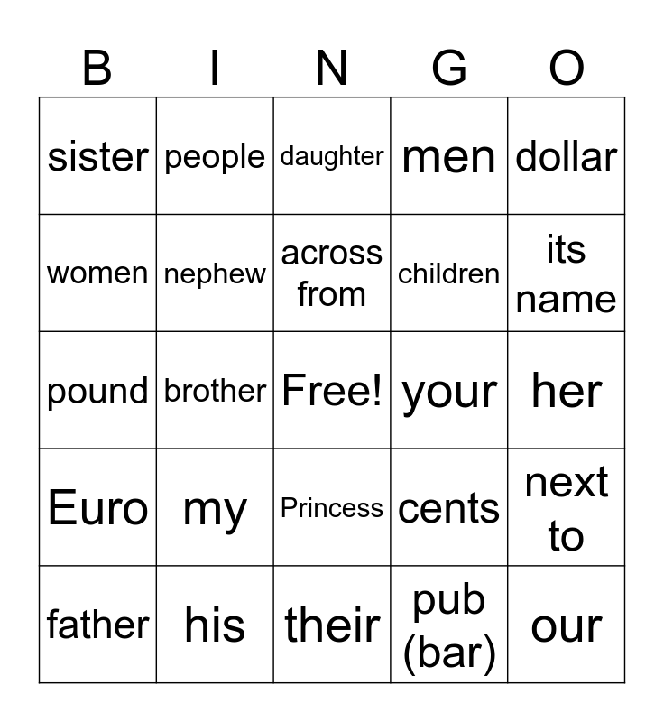 This bingo card has a free space and 29 words: father, mother, brother, uncle, sister, daughter, nephew, my, your, his, her, our, their, pub (bar), its name, it's interesting, Princess, Euro, dollar, pound, cents, cheese sandwich, children, women, men, people, next to, across from and Empanadas from Vero.