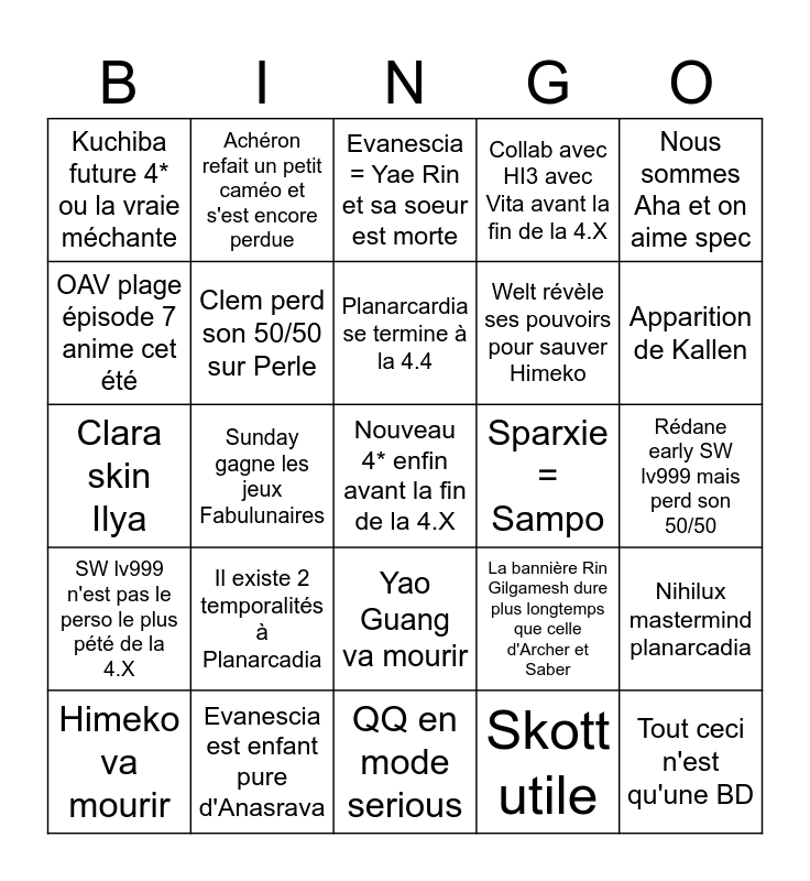 This bingo card has a free space and 24 words: Il existe 2 temporalités à Planarcadia, Evanescia est enfant pure d'Anasrava, Planarcardia se termine à la 4.4, Himeko va mourir, Nous sommes Aha et on aime spec, Kuchiba future 4* ou la vraie méchante, OAV plage épisode 7 anime cet été, Achéron refait un petit caméo et s'est encore perdue, Sparxie = Sampo, Yao Guang va mourir, Welt révèle ses pouvoirs pour sauver Himeko, Clara skin Ilya, La bannière Rin Gilgamesh dure plus longtemps que celle d'Archer et Saber, Nihilux mastermind planarcadia, Clem perd son 50/50 sur Perle, Skott utile, Rédane early SW lv999 mais perd son 50/50, Evanescia = Yae Rin et sa soeur est morte, Apparition de Kallen, Sunday gagne les jeux Fabulunaires, Tout ceci n'est qu'une BD, SW lv999 n'est pas le perso le plus pété de la 4.X, Collab avec HI3 avec Vita avant la fin de la 4.X and QQ en mode serious.