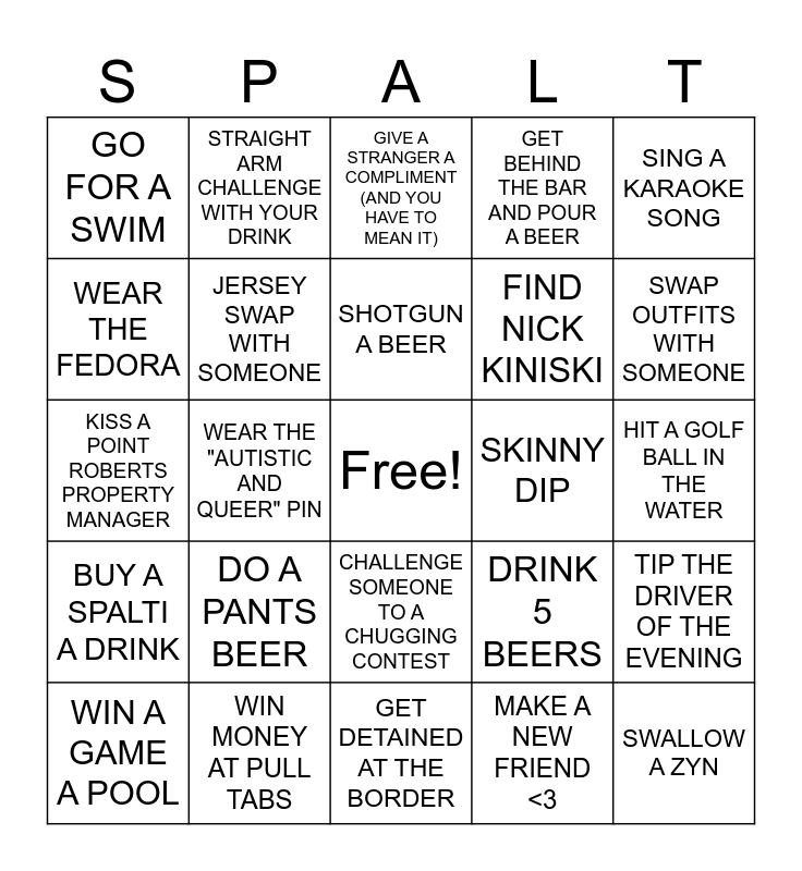 This bingo card has a free space and 24 words: DO A PANTS BEER, WIN MONEY AT PULL TABS, SHOTGUN A BEER, WIN A GAME A POOL, SING A KARAOKE SONG, GO FOR A SWIM, WEAR THE FEDORA, STRAIGHT ARM CHALLENGE WITH YOUR DRINK, SKINNY DIP, CHALLENGE SOMEONE TO A CHUGGING CONTEST, FIND NICK KINISKI, KISS A POINT ROBERTS PROPERTY MANAGER, DRINK 5 BEERS, TIP THE DRIVER OF THE EVENING, JERSEY SWAP WITH SOMEONE, MAKE A NEW FRIEND <3, HIT A GOLF BALL IN THE WATER, GIVE A STRANGER A COMPLIMENT (AND YOU HAVE TO MEAN IT), SWAP OUTFITS WITH SOMEONE, WEAR THE "AUTISTIC AND QUEER" PIN, SWALLOW A ZYN, BUY A SPALTI A DRINK, GET BEHIND THE BAR AND POUR A BEER and GET DETAINED AT THE BORDER.