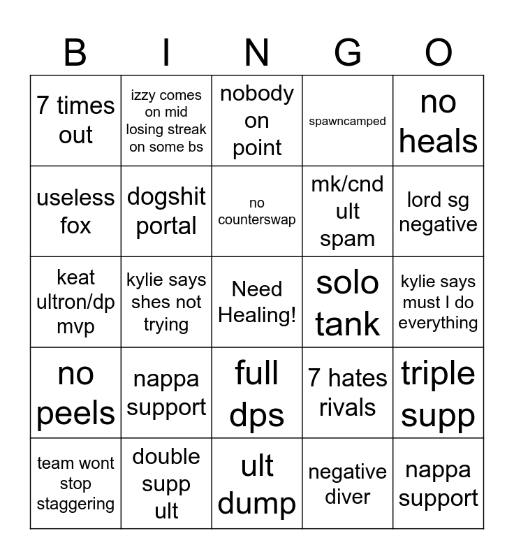 This bingo card has a free space and 24 words: nappa support, double supp ult, no counterswap, team wont stop staggering, no heals, 7 times out, useless fox, izzy comes on mid losing streak on some bs, solo tank, full dps, mk/cnd ult spam, keat ultron/dp mvp, 7 hates rivals, triple supp, dogshit portal, negative diver, kylie says must I do everything, nobody on point, lord sg negative, kylie says shes not trying, nappa support, no peels, spawncamped and ult dump.