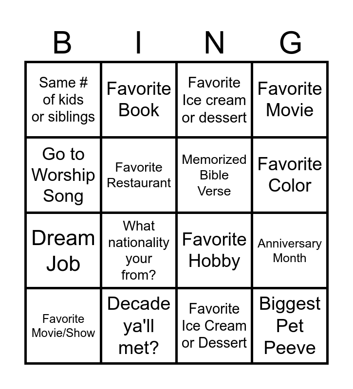 This bingo card has 20 words: Anniversary Month, First Trip together, Favorite Ice cream or dessert, Favorite Holiday, Favorite Movie/Show, Go to Worship Song, Decade ya'll met?, Same # of kids or siblings, Dream Job, Favorite Book, What nationality your from?, Favorite Hobby, Favorite Restaurant, Biggest Pet Peeve, Memorized Bible Verse, Favorite Color, Favorite Color, Favorite Movie, Favorite Ice Cream or Dessert and Favorite Worship Song.