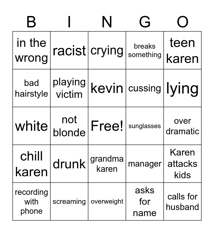 This bingo card has a free space and 24 words: drunk, screaming, kevin, recording with phone, teen karen, in the wrong, bad hairstyle, racist, sunglasses, grandma karen, cussing, white, manager, Karen attacks kids, playing victim, asks for name, over dramatic, crying, lying, not blonde, calls for husband, chill karen, breaks something and overweight.