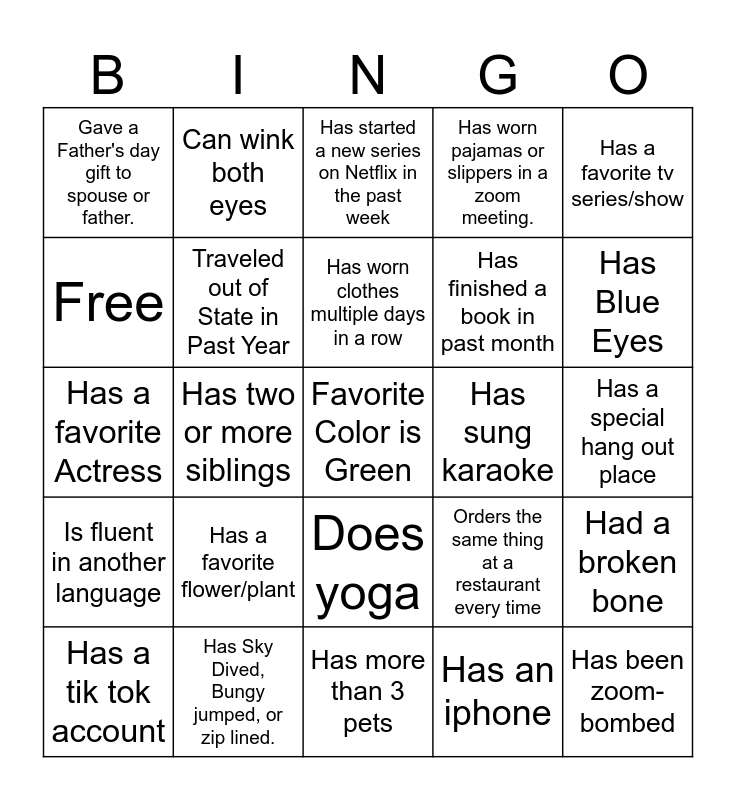 This bingo card has 60 words: Filed more than 5 returns last week, Has Sky Dived, Bungy jumped, or zip lined., Has a pet, Is fluent in another language, Has an iphone, Has run a race or triathlon, Traveled out of State in Past Year, Does something to relieve stress during the day, Has finished a book in past month, Has more than one Turbo Tax swag item, Has worn pajamas or slippers in a zoom meeting., Has a Tattoo, Free, Plays or has played an Instrument, Has a favorite activity with their kids/family, Gave a Father's day gift to spouse or father., Favorite Color is Green, Has a favorite tv series/show, Has a special dance move, Has worn clothes multiple days in a row, Has sung karaoke, Has started a new series on Netflix in the past week, Has a tik tok account, Had a broken bone, Likes Raw Oysters, Prefers the Beach, Has gone camping, Has served in the armed forces, Has Blue Eyes, Has been in a movie, Has met a celebrity, Has a family pet, Has an annual family vacation, Has a favorite meal/food to cook, Can wink both eyes, Birthday month starts with letter "J", Has a favorite song to sing, Has two or more siblings, Has a favorite Actor, Has a favorite Actress, Has a membership to fitness club, Has a favorite flower/plant, Has a special hang out place, Has a unique talent, Orders the same thing at a restaurant every time, Has a hobby, Downloaded New App in Past Month, Has a family member overseas, Has a treadmill that DOES NOT have clothes hanging on it, Does yoga, Has more than 3 pets, Has an unusual pet, Lives on more than 3 acres, Has been on a cruise, Is ambidextrous, Is color blind, Can tap dance, Can name all 7 dwarfs (from Snow White), Has been zoom-bombed and Has Painted Toe Nails.