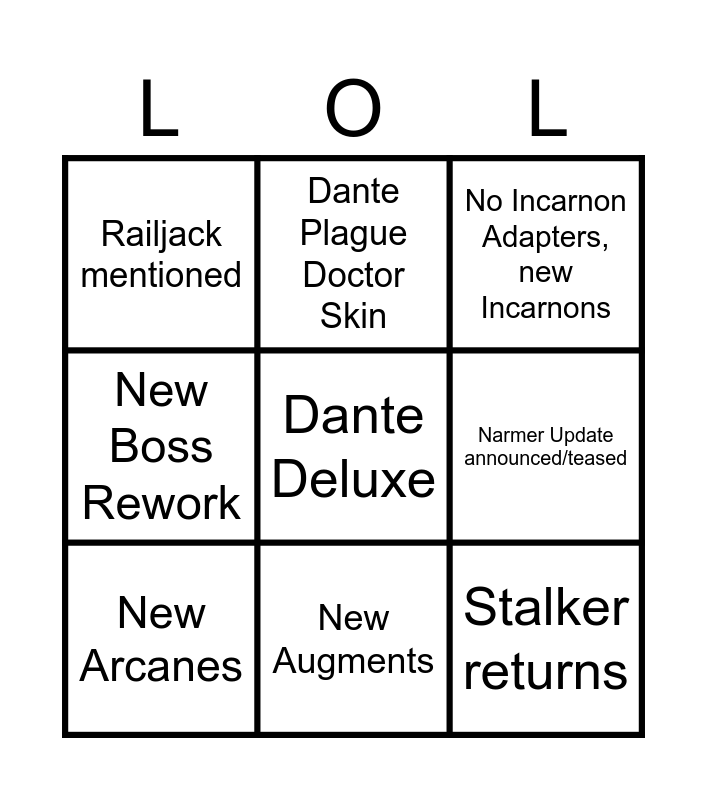 This bingo card has a free space and 8 words: Narmer Update announced/teased, No Incarnon Adapters, new Incarnons, Dante Plague Doctor Skin, New Arcanes, Railjack mentioned, Stalker returns, New Boss Rework and New Augments.
