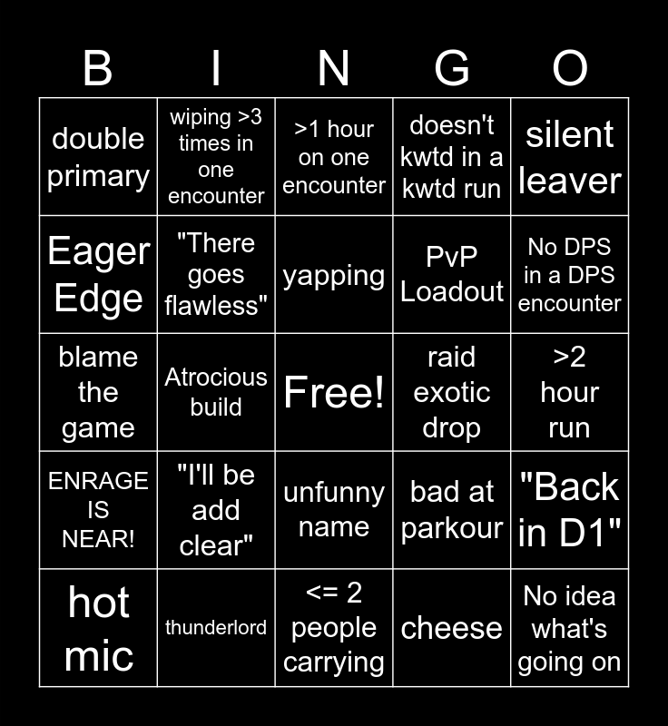This bingo card has a free space and 24 words: "I'll be add clear", thunderlord, yapping, hot mic, silent leaver, double primary, Eager Edge, wiping >3 times in one encounter, raid exotic drop, unfunny name, PvP Loadout, blame the game, bad at parkour, "Back in D1", "There goes flawless", cheese, >2 hour run, >1 hour on one encounter, No DPS in a DPS encounter, Atrocious build, No idea what's going on, ENRAGE IS NEAR!, doesn't kwtd in a kwtd run and <= 2 people carrying.