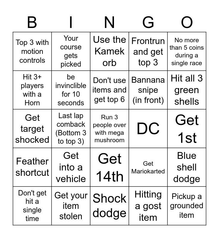 This bingo card has 25 words: Get into a vehicle, Shock dodge, Don't use items and get top 6, Don't get hit a single time, No more than 5 coins during a single race, Top 3 with motion controls, Hit 3+ players with a Horn, Your course gets picked, DC, Get 14th, Bannana snipe (in front), Get target shocked, Get Mariokarted, Blue shell dodge, be invinclible for 10 seconds, Pickup a grounded item, Get 1st, Use the Kamek orb, Hit all 3 green shells, Last lap comback (Bottom 3 to top 3), Run 3 people over with mega mushroom, Get your item stolen, Feather shortcut, Frontrun and get top 3 and Hitting a gost item.
